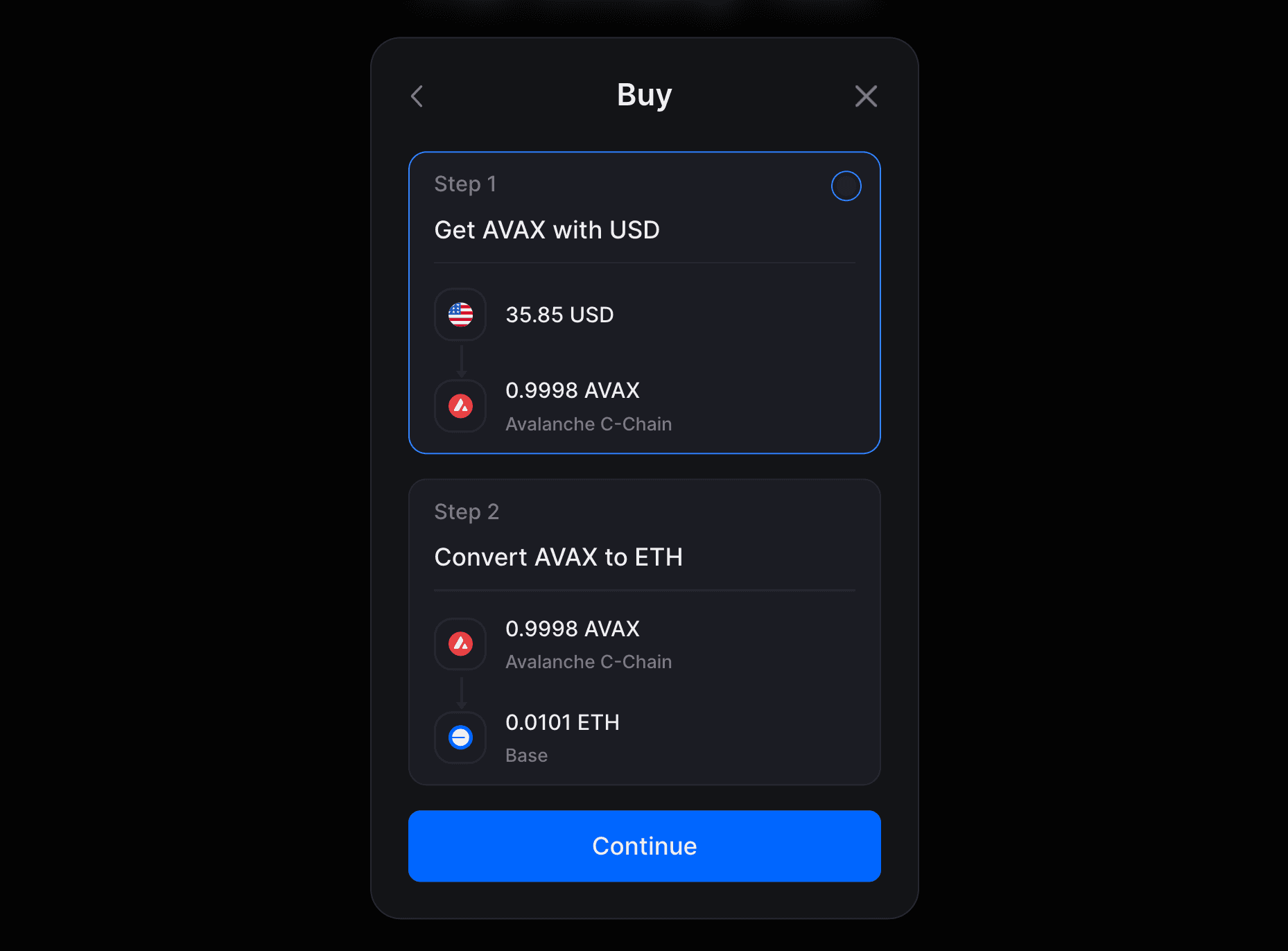 • Users will be prompted to convert Avalanche AVAX to Base ETH